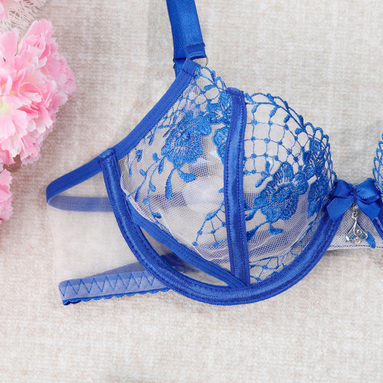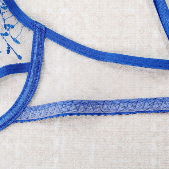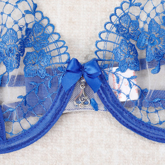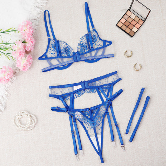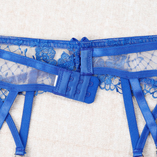 Inspired by the sunlit alleys of the Cyclades, this three-piece set combines boldness and elegance. Royal blue embroidered lace over nude mesh recalls the Mediterranean waves. The underwired bra enhances the bust naturally, while the high-waisted garter belt sensually flatters the curves. A piece that invites travel, seduction and sophistication.